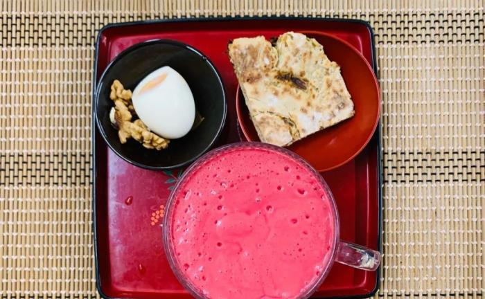 Day 4. 乳酸菌全麥蔥花餅+紅菜芒果思慕昔+雞蛋+核桃仁